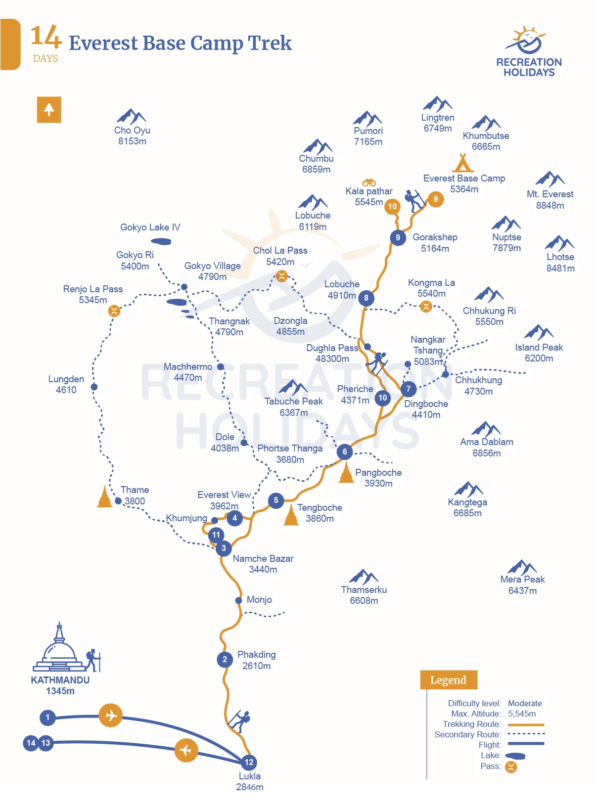 The Everest Base Camp trek is a legendary 14-day Himalayan journey offering breathtaking views of Mount Everest, Lhotse, and Ama Dablam. If you're planning your Everest Base Camp trek 2025 or 2026, Recreation Holidays provides expertly guided treks with all-inclusive services to make your adventure safe, memorable, and hassle-free. Our professionally designed Everest Base Camp trek packages cover everything — from experienced Everest Base Camp trek guides, accommodations, and logistics to required Everest Base Camp trek permits. Whether you're searching for the Mount Everest Base Camp trek cost, comparing the price for Everest Base Camp trek, or looking for reliable Everest Base Camp trek operators, we offer transparent pricing and expert support. With our guided Everest Base Camp trek, you'll walk through Sherpa villages, explore the Khumbu region, and follow a detailed Everest Base Camp trek itinerary led by certified Everest Base Camp trek guides. Choose the best time for Everest Base Camp trek and let Recreation Holidays turn your trekking dream into reality.
